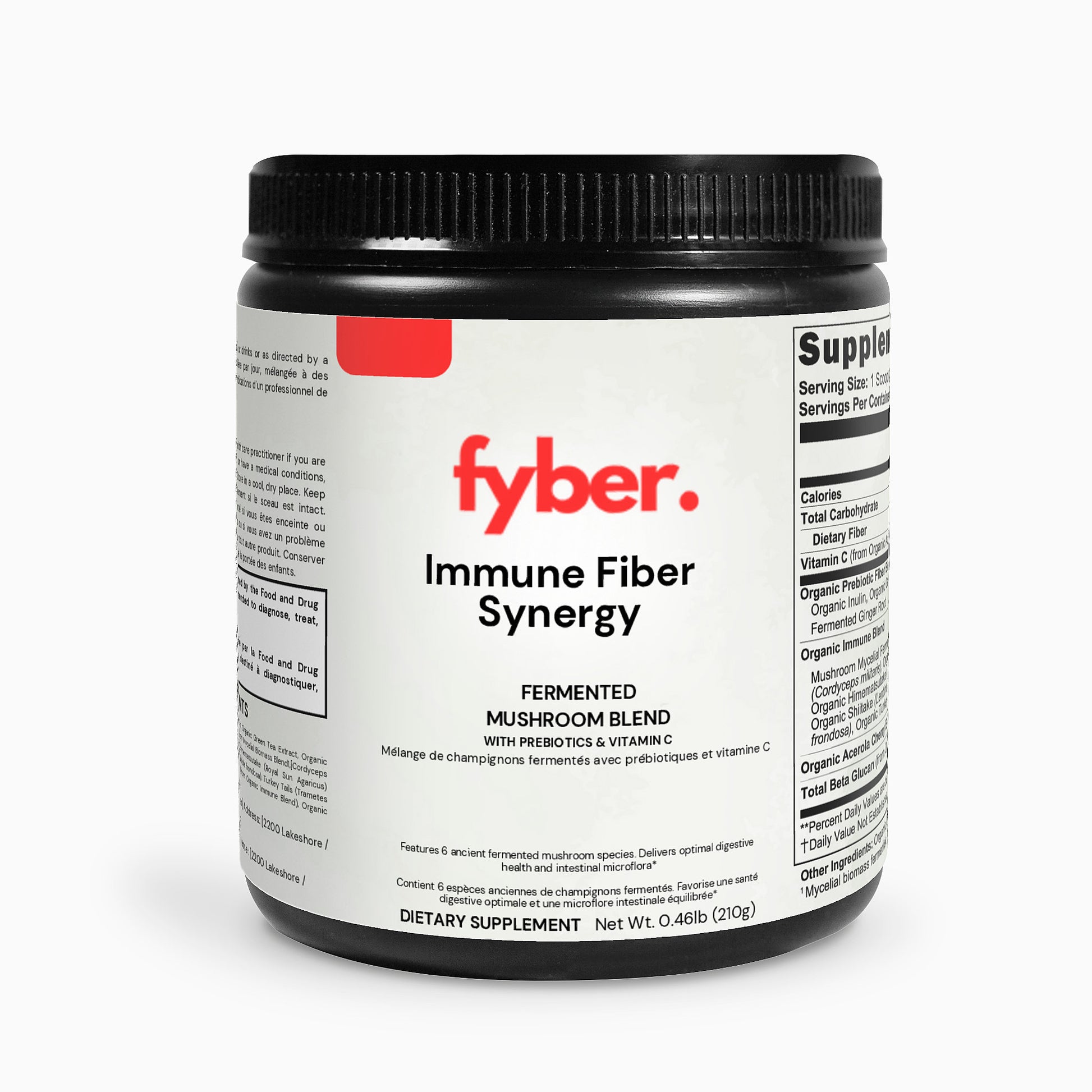 Ingredients: Vitamin C, Organic Prebiotic Fiber Blend (Organic Inulin, Organic Green Tea Extract, Organic Fermented Ginger Root), Organic Immune Blend (Mushroom Mycelial Biomass Blend,[Cordyceps (Cordyceps militaris), Reishi (Ganoderma lucidum), Himematsutake (Royal Sun Agaricus) (Agaricus blazei), Shiitake (Lentinula edodes), Maitake (Grifola frondosa), Turkey Tails (Trametes versicolor)], Acerola Cherry Extract, Total Beta Flucan (from Organic Immune Blend), Organic Cassava Maltodextrin